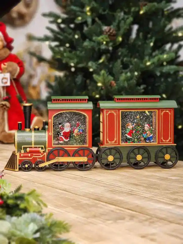 Encante sua decoração natalina com este trenzinho iluminado com globo de água em movimento. Uma peça única que combina luzes cintilantes, música e efeito de neve giratória, criando um clima mágico e sofisticado para sua casa.